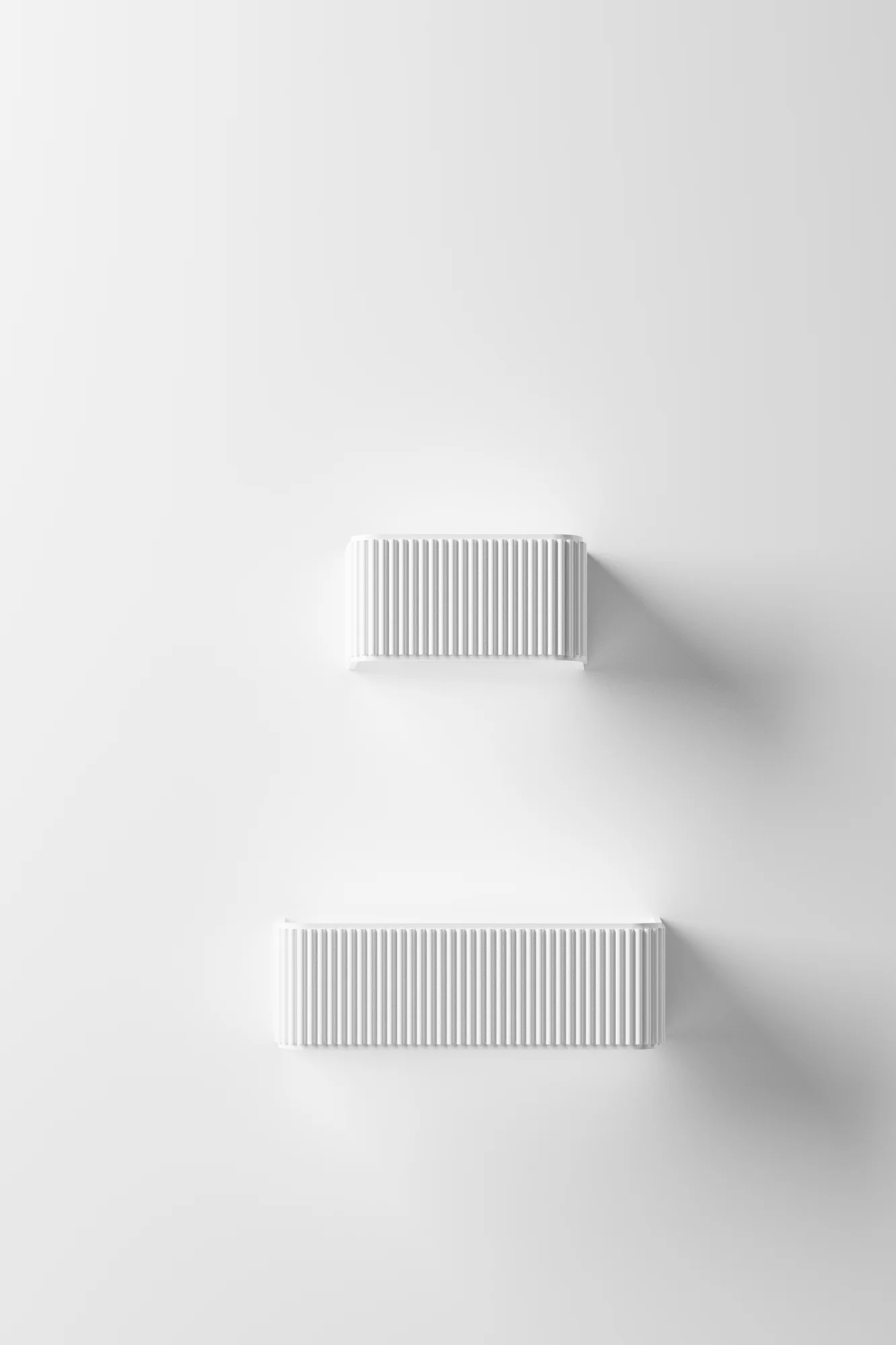 Dresscode is a technical wall light with an elegant "dress". The shade is made of extruded aluminum and evokes the shape of a half lampshade made of pleated and hemmed fabric. The wall-mounted lamp diffuses light upwards and downwards via a dimmable LED source. Available in two size options in a variety of finishes.