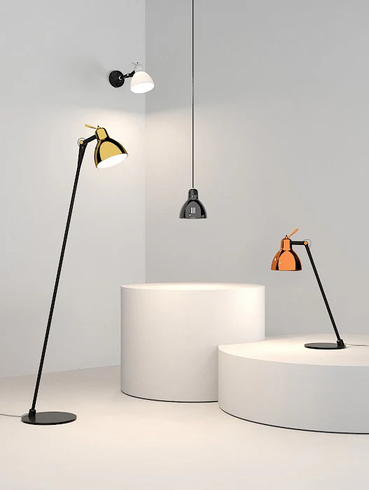 A continuation of the Luxy range from Rotaliana, the Luxy Glam Floor Lamp offers a classic inspired form in a contemporary finish. The use of a gloss finished diffuser gives both direct and diffused light. Available in metalic black frame with gloss white, smoke, copper or gold shade. Made in Italy.